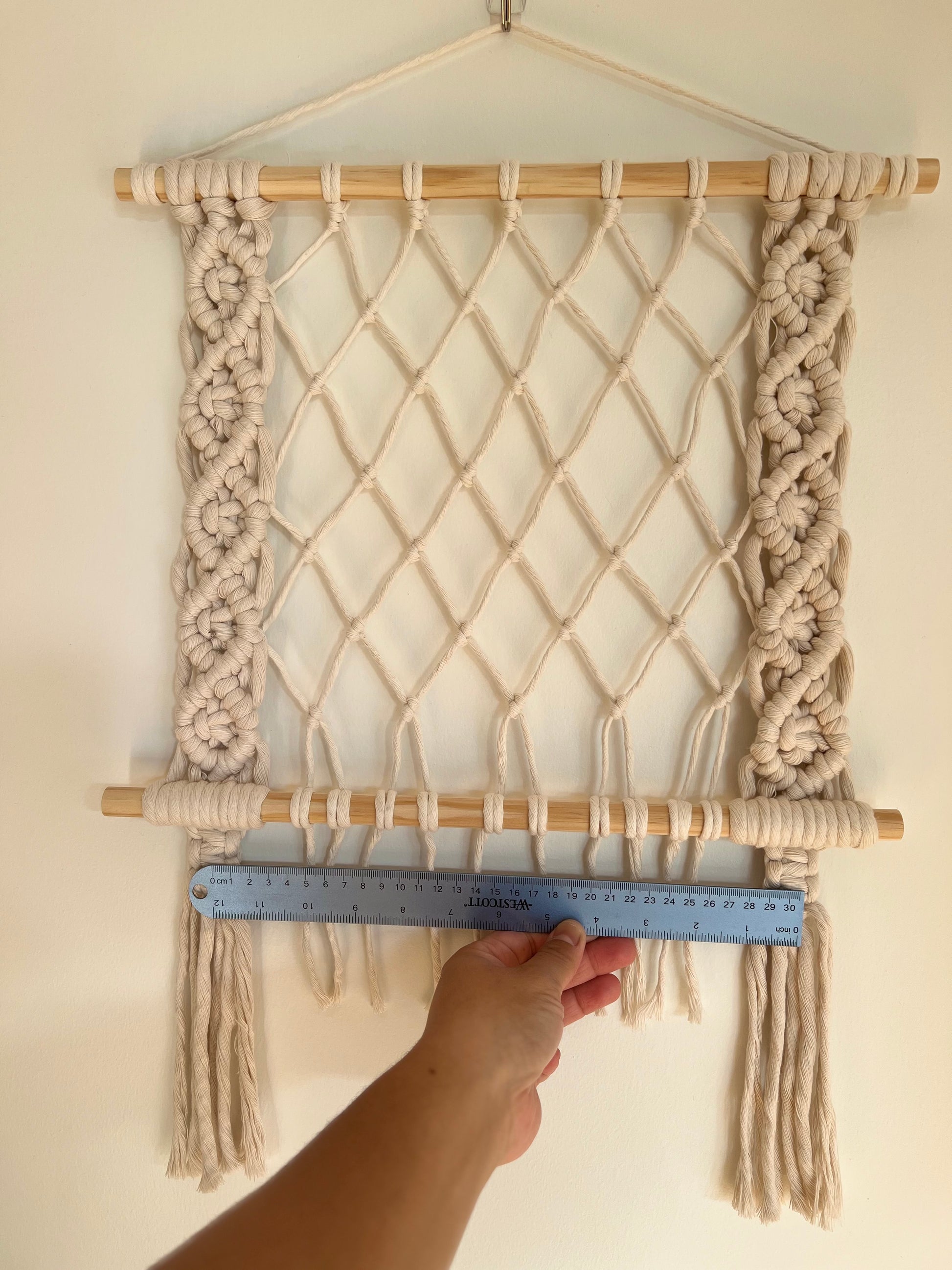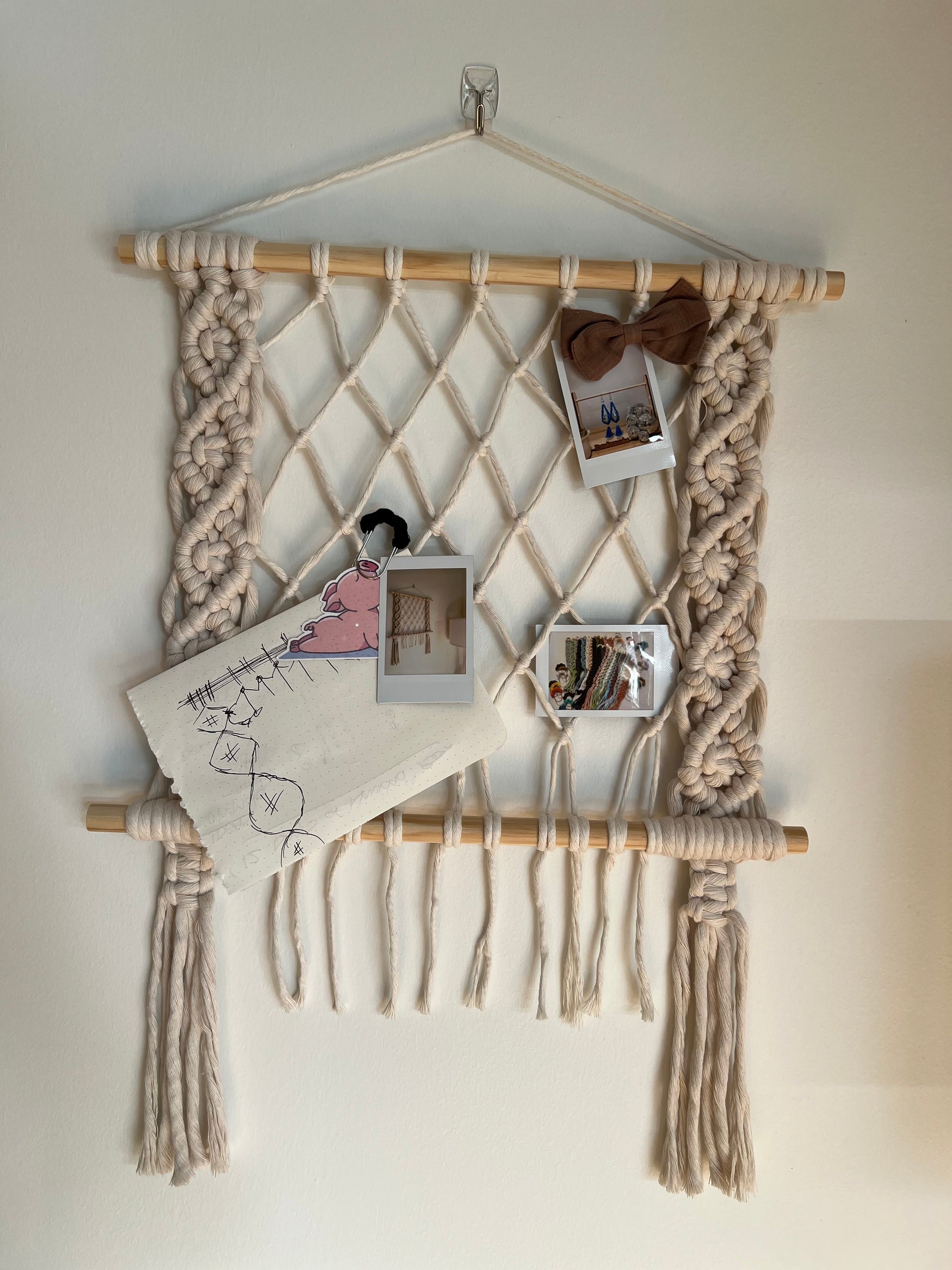 Create a macrame wall hanging designed to hold photos, notes, and little reminders that make you smile. A functional, feel-good piece that works as a vision board, photo display, or simple wall décor.